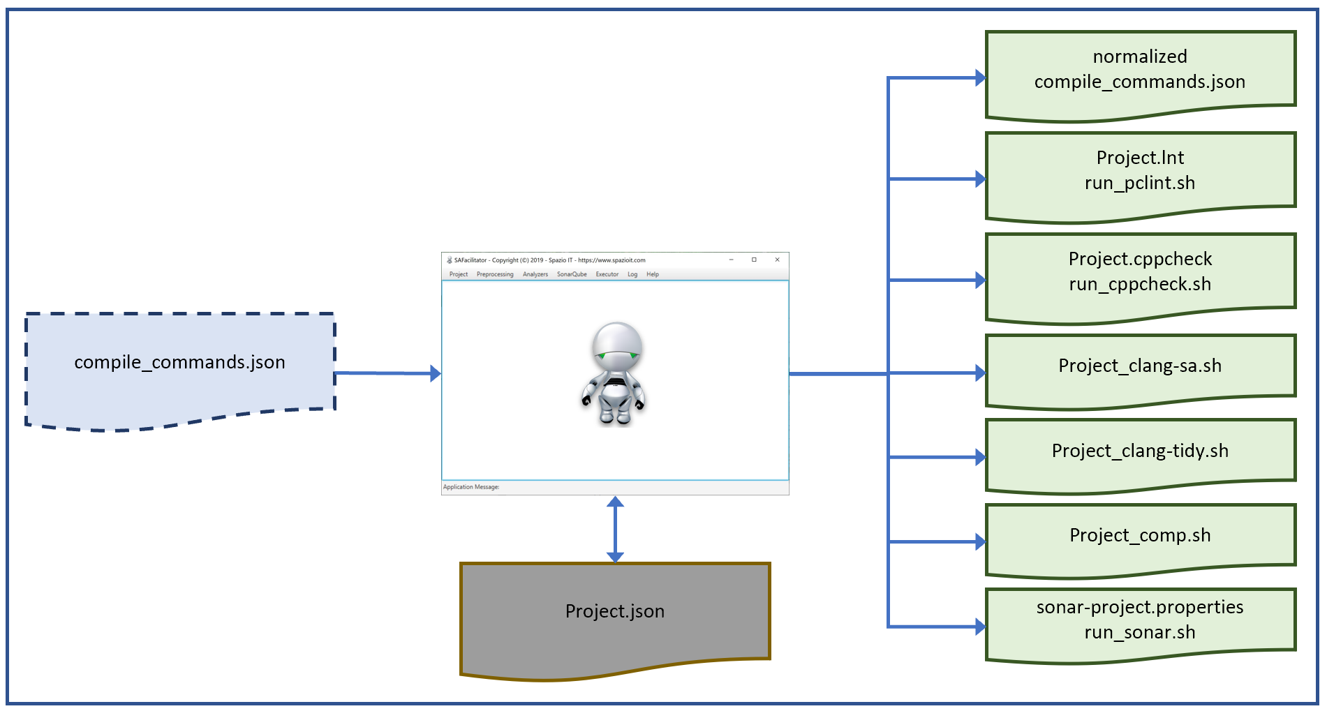For the C/C++ programming language the SAFacilitator allows the user to create/edit a single project file (e.g. "Project.json") and automatically generate from this project file all configuration files required by the C/C++ Static Analyzers included in the SAFe Toolset, that is: